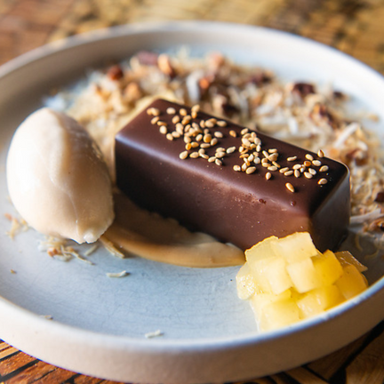 Baked yuzu chocolate mousse (gluten free) topped with milk chocolate cream and dusted with yogurt powder